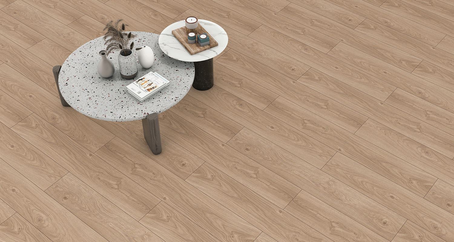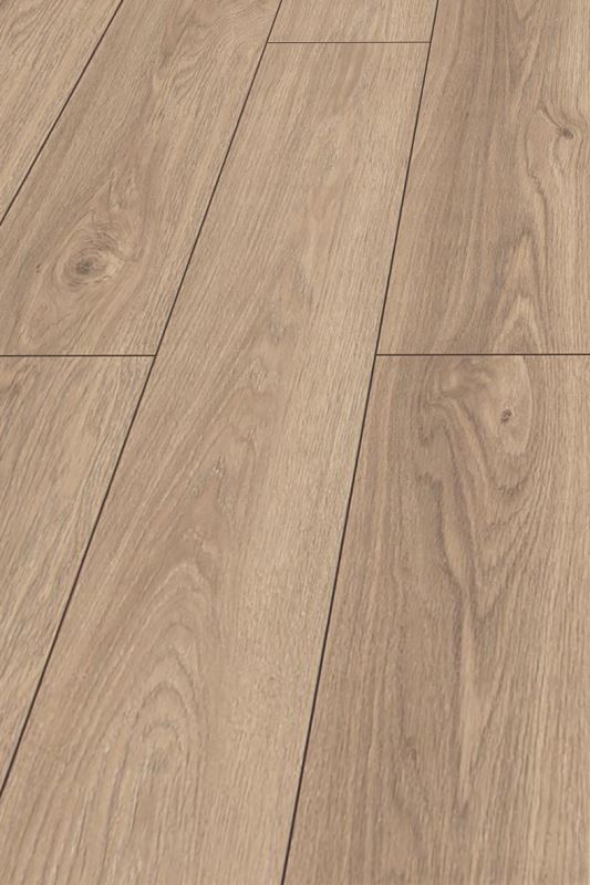 De laminaatvloer op de foto die wordt weergegeven op het beeldscherm van de smartphone, desktop of tablet kan afwijken van de originele kleur.