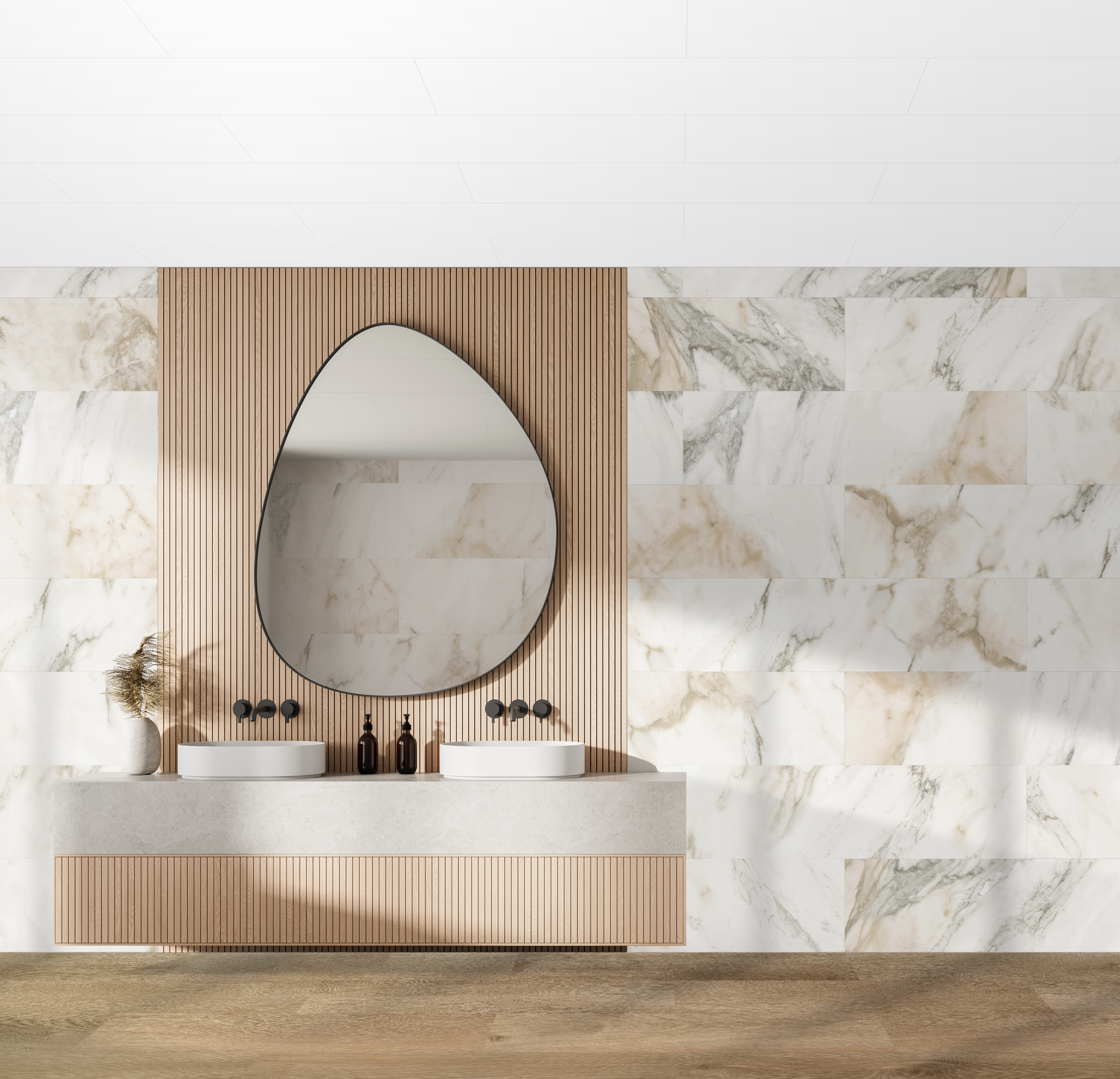 Korte panelen met dubbel kliksysteem. Bevestig aan latten of verlijm direct op wand, vloer of plafond. Ideaal voor vochtigeruimtes zoals de badkamer.